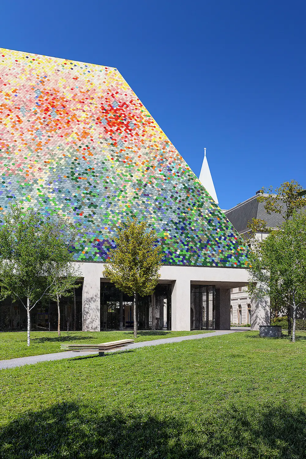 The most challenging aspect of this project was a 2,600 m² ceramic roof clad with more than 100,000 individually coloured tiles across 65 distinct shades. Each piece was specified using a vector distribution generated from a watercolour sketch that seeded a custom algorithm.